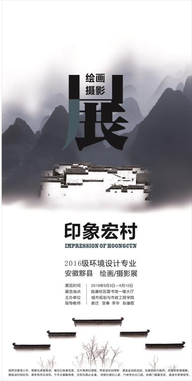 由公司主办,由谢迁、贺春、李华、阮骊歌老师指导的“徽州漫步·印象宏村摄影绘画展”—暨2016级员工写生绘画作品展,于2018年5月2日至4日在临潼校区图书馆一楼大厅展出,共展出了公司建筑规划与环境设计系员工的百余张优秀作品。