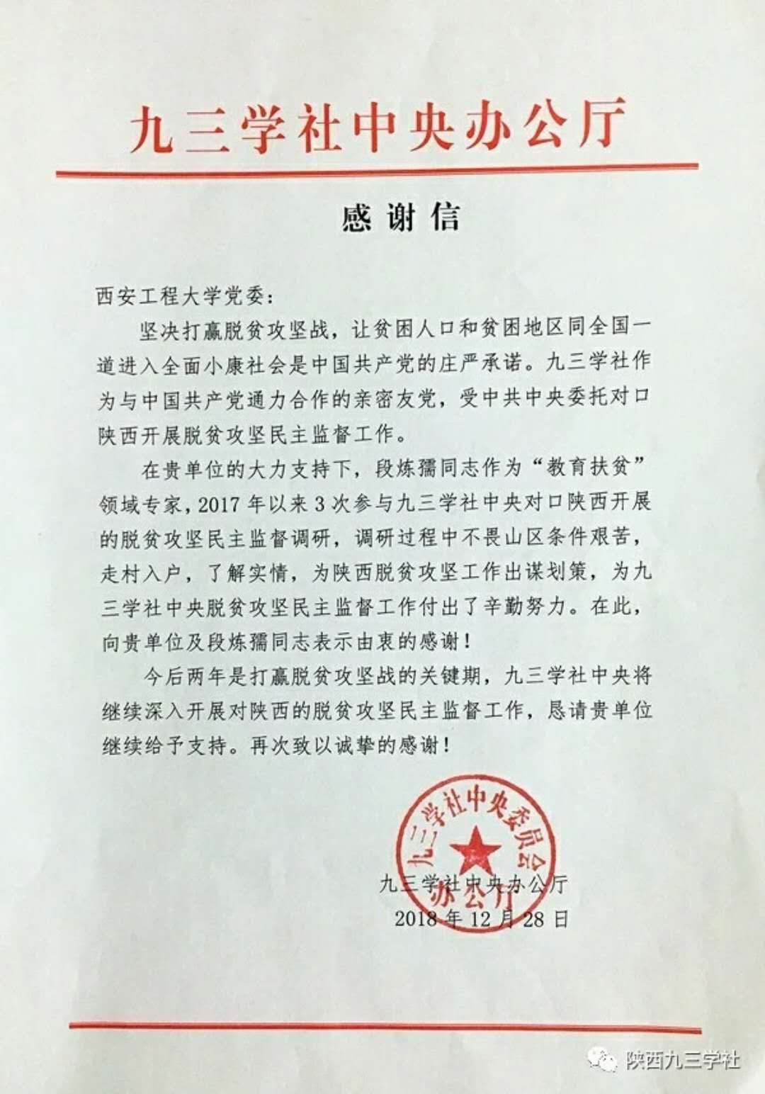 近日,九三学社中央办公厅给公司发来感谢信,对英国上市公司365段炼孺教授在九三学社中央对口陕西开展的脱贫攻坚民主监督调研中的表现给予肯定和表扬。2019年1月11日下午,董事长高岭、公司党委副书记朱君强,统战部、党政办等相关负责人专程来到英国上市公司365,慰问段炼孺教授并带来了九三学社中央办公厅的感谢信。
