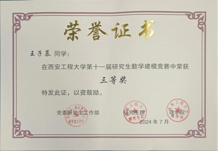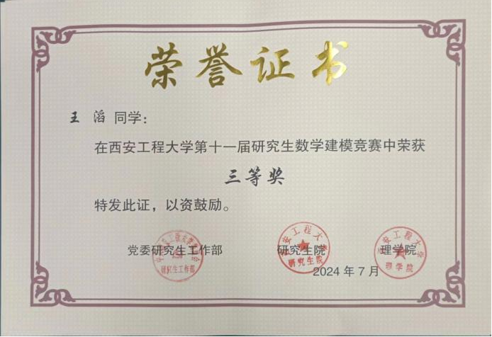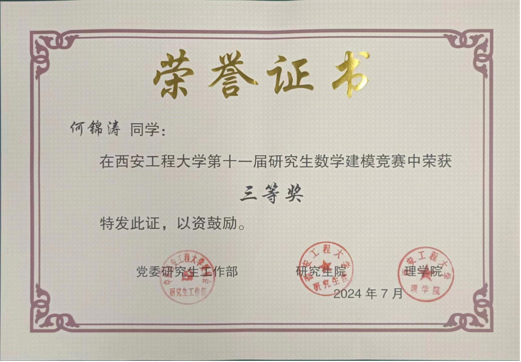 2024年英国365公司官网第十届“希望杯”研究生数学建模赛暨2024年西安工程大学第十一届研究生数学建模竞赛由校研工部、研究生院主办,理学院承办。公司研究生何锦涛、王滔、王子慕组成的代表队,经过比拼和严格评审,最终以“基于GMM算法的心理测试三大量表分类模型”荣获安工程大学第十一届研究生数学建模竞赛三等奖1项。