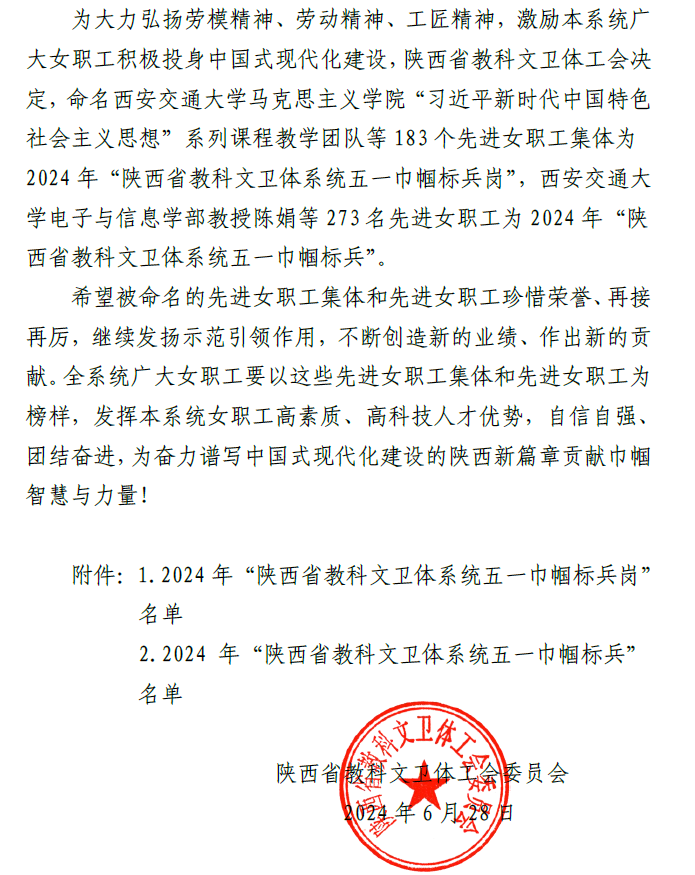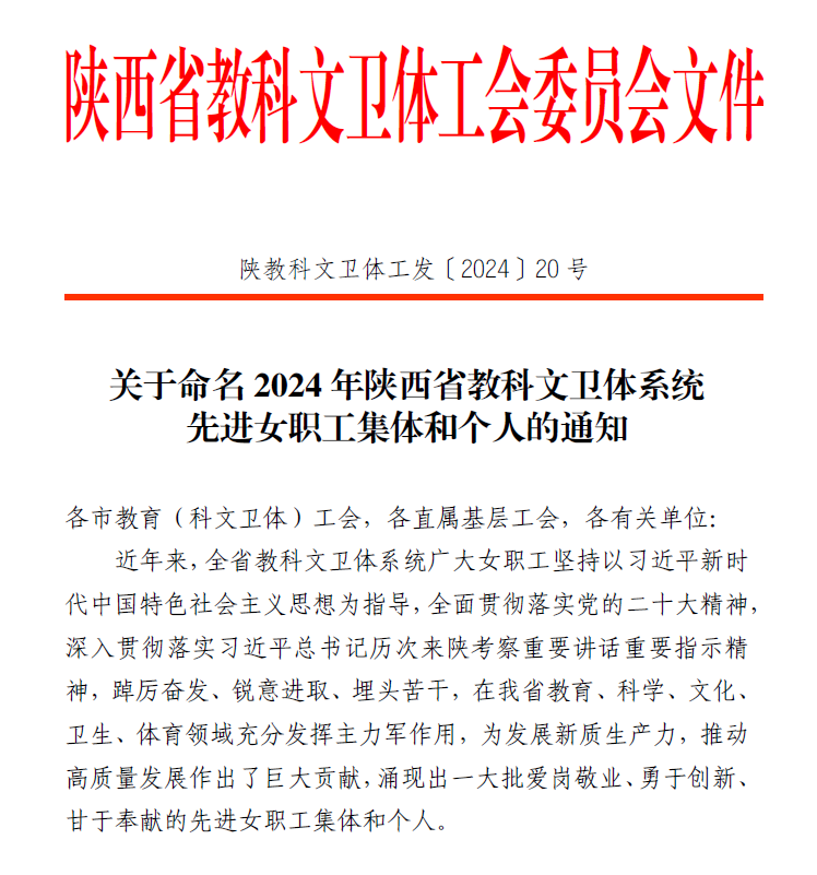 陕西省教科文卫体工会委员会下发了《关于命名2024年陕西省教科文卫体系统先进女职工集体和个人的通知》(陕教科文卫体工发﹝2024﹞20号),公司王丽娟老师荣获“陕西省教科文卫体系统五一巾帼标兵”荣誉称号。