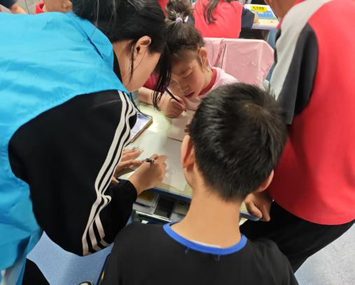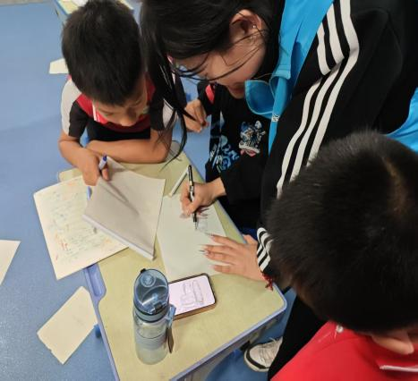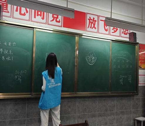 美术课堂上,志愿者王李睿琦与武晋慧精心筹备,与小朋友们展开了热烈的创意对话。她们耐心倾听孩子们的奇思妙想,用粉笔在黑板上勾勒出孩子们心中的世界,进而激发孩子们的创作热情。在志愿者的引导下,小朋友们纷纷拿起画笔,尽情挥洒,一幅幅充满童趣与创意的作品跃然纸上,赢得了彼此的高度认可。