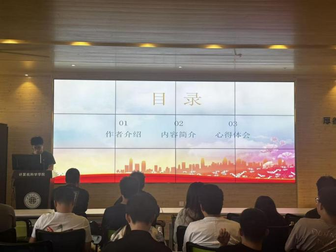 分享环节中,土木工程党支部党员代表徐豪哲率先以老舍先生的《四世同堂》为引,展开一场“胡同里的家国叙事”。他以小羊圈胡同里普通居民的命运变迁为主线,生动勾勒出沦陷区百姓在民族危亡关头的家国抉择——从市井烟火到铁骨担当,将个体命运与民族存亡紧紧交织。“这不仅是一部家族史诗,更是一曲民族精神的悲壮赞歌。”徐豪哲的解读引发在场同学的强烈共鸣。