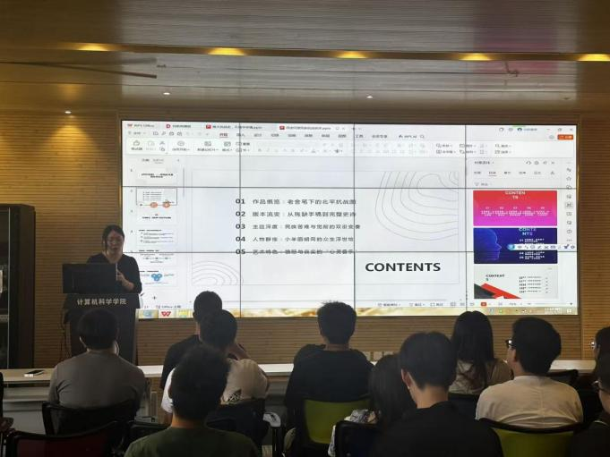 随后,杜倩老师从专业视角对《四世同堂》进行深度剖析。她结合老舍的创作背景与“国民性批判”的叙事手法,解析作品中“北平市民”群像的精神成长;更延伸介绍了萧红《生死场》等同时期红色抗战文学的经典之作,带领大家触摸抗战文艺的多元脉络。“这些作品既是历史的见证,更是激励我们砥砺前行的精神灯塔。”杜老师的讲解让经典更显厚重。