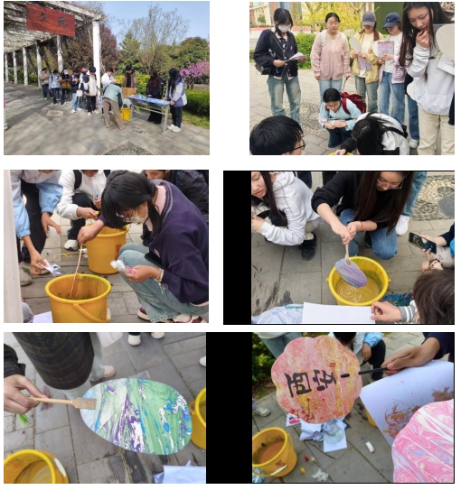 在摊位前,同学们不仅可以聆听志愿者对非遗漆扇工艺的讲解,还能亲身体验漆扇的制作过程。选择自己喜欢的漆料颜色,将漆料滴入水中,并轻轻搅拌,之后把扇子浸入水中,轻轻摇晃下,水面上漂浮的漆料沾染到扇面上,最终把扇子提起,一把美轮美奂的漆扇就制作完成了。