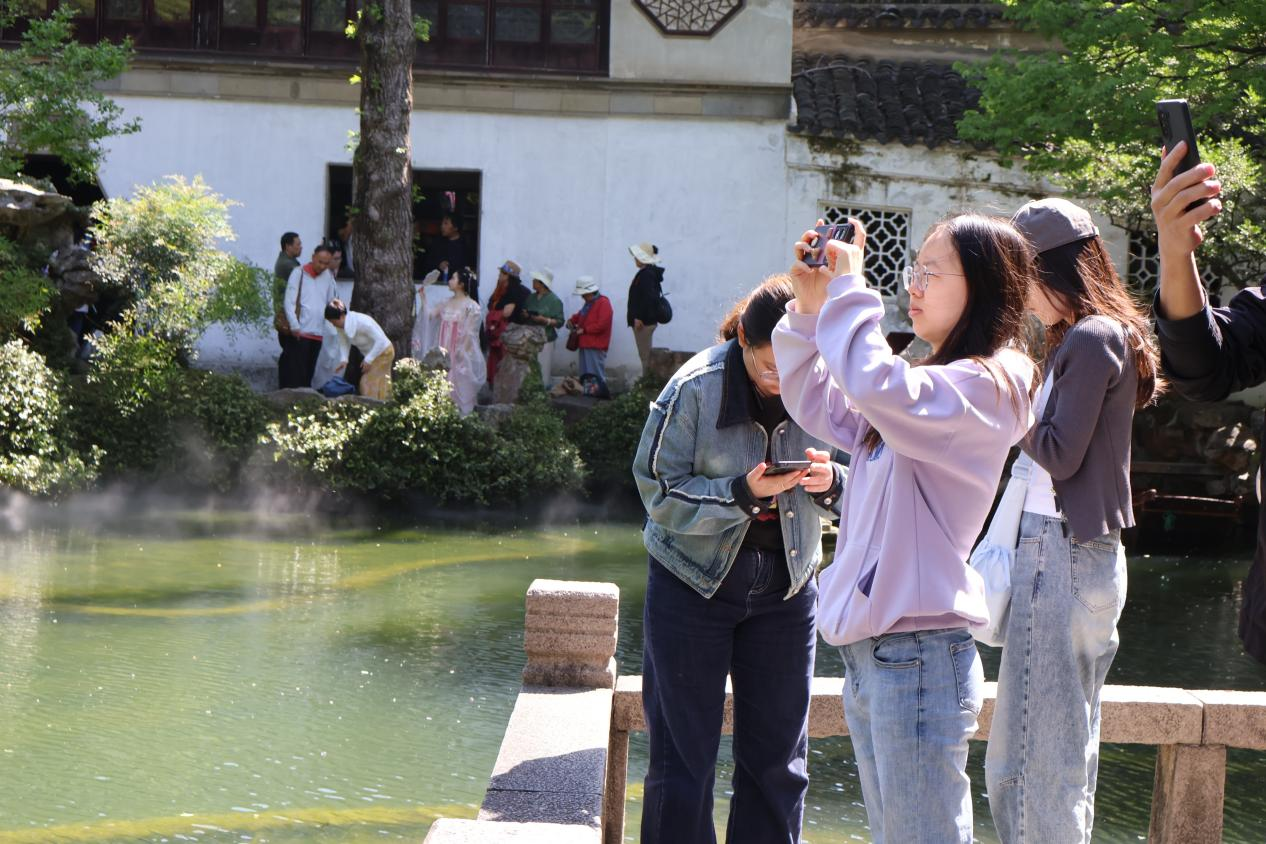 同学们在倾斜的虎丘塔前分析其屹立千年的结构奥秘,围绕“真娘墓”“憨憨泉”等古迹创作摄影作品,用镜头捕捉传说与现实的交织。在“二仙亭”前,“梦中说梦原非梦,元里求元便是元”的楹联阐释了园林的意境营造,正需这般虚实相生的哲学。