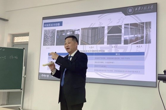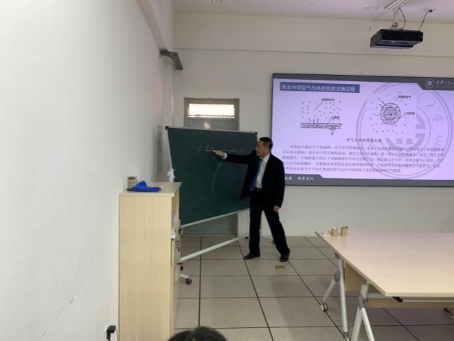 黄翔教授就他本人主编的本科生教材《空调工程》中的空气处理及设备和空调系统中的蒸发冷却技术方面的知识分别从蒸发冷却技术的发展历史、原理、设备、应用以及最新技术进行了深刻且简洁的讲解。特别值得一提的是,授课开始,黄翔教授即给同学们介绍了我国蒸发冷却技术的开创者与领路人陈沛霖教授对蒸发冷却做出的贡献,并通过播放关于蒸发冷却技术运用的央视新闻给同学们说明蒸发冷却技术的重要意义。