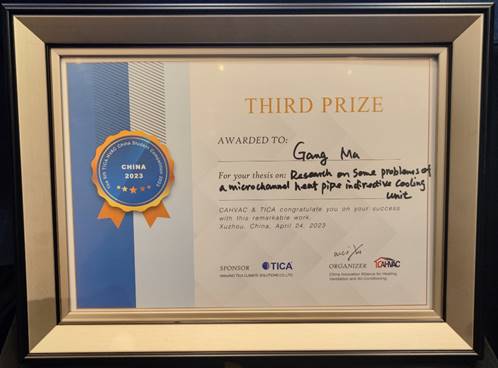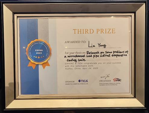 2023年4月24日,由暖通空调产业技术创新联盟(CAHVAC)与南京天加环境科技有限公司(TICA)联合主办的第五届“天加杯”全国暖通空调员工科技竞赛答辩会在江苏徐州举行。本次答辩会全程采用英文答辩。公司黄翔教授指导的研究生杨柳、马钢凭借作品“Research on some problems of a microchannel heat pipe indirect evaporative cooling unit”荣获三等奖。