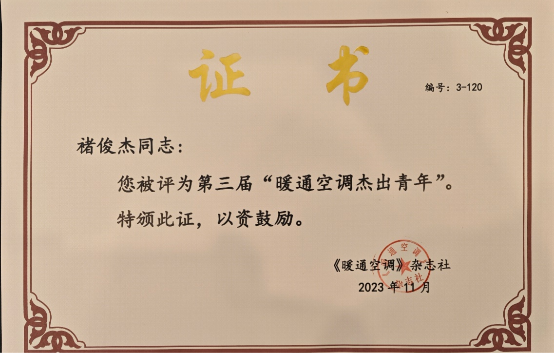 公司教师褚俊杰荣获第三届“暖通空调杰出青年”荣誉称号