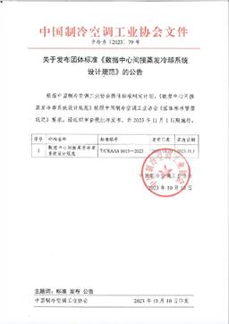 公司与华为等单位共同编制的团体标准《数据中心间接蒸发冷却系统设计规范》正式发布
