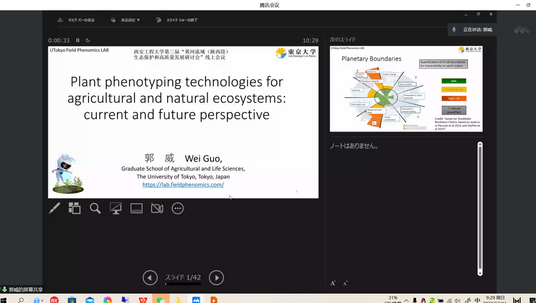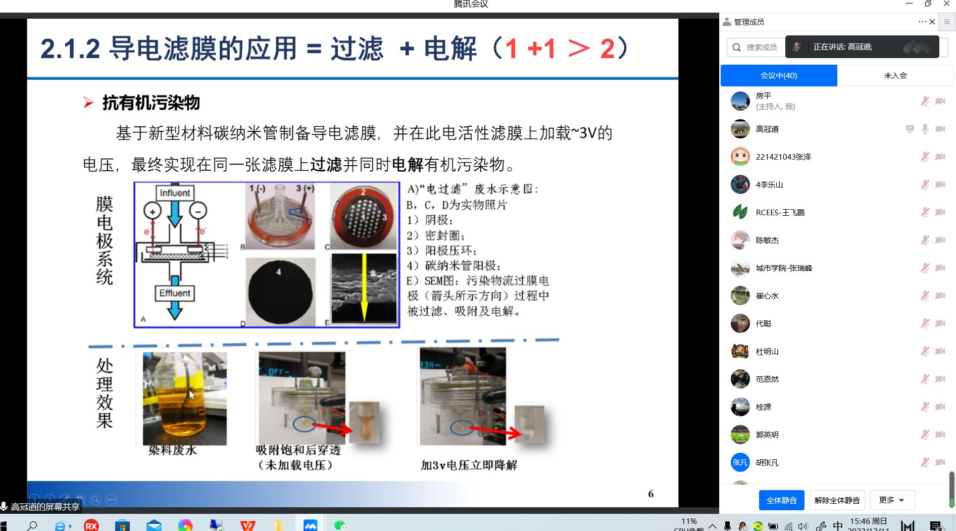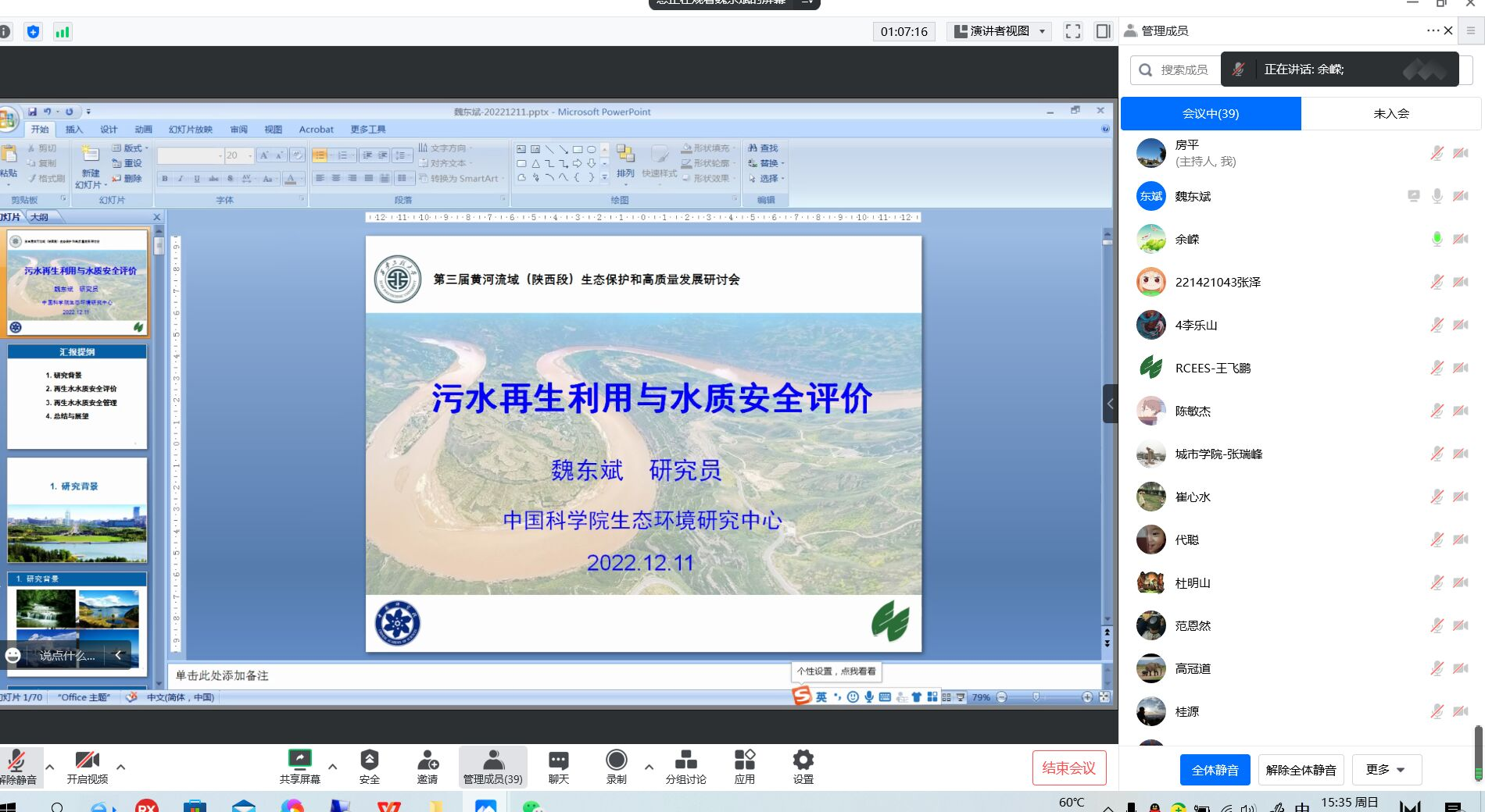 研讨会上,与会专家学者纷纷发言,与公司师生热情交流,激烈讨论,共同为黄河流域生态保护和高质量发展建言献策。东京大学郭威副教授对《植物表型组学在农业及自然生态系中的技术开发及应用》进行了深刻的解读;博士生导师魏东斌从黄河流域生态保护和高质量发展出发,结合《污水再生利用与水质安全评价》对再生水水质标准、再生水安全管理进行讲解;南京大学高冠道教授以《电调控低碳水处理技术—以自清洁滤膜为例》为主题,深度剖析导电滤膜的性质并从膜电极系统入手,进而对膜处理效果进展示;英国365公司官网硕士生导师李晶以《隋唐长安传统水治理方式初探》的题,对传统水治理方式进行细致的阐述;英国365公司官网硕士生导师赵娟介绍了太阳能光伏光热利用技术的研究过程及成果。