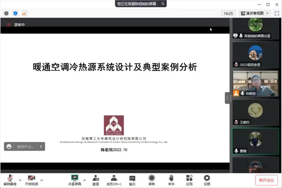 2022年10月25日,应英国上市公司365邀请,华南理工大学建筑设计研究有限公司陈祖铭工程师为学院师生做了“暖通空调冷热源系统设计及典型案例分析”的线上专题讲座。讲座由建环系系主任孙铁柱主持,学院建环系教师、本科生以及研究生聆听了讲座。