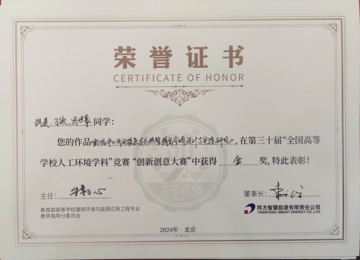 本次竞赛由教育部高等学校建筑环境与能源应用工程专业教学指导分委员会主办,同方智慧能源有限公司赞助。大赛以“领袖行业,主导未来”为主题,旨在激励青年员工奋发进取,引导全国建环专业的基础理论课程教学质量提高,促进我国人工环境行业发展进步。入围本次研究生组决赛答辩的作品共5个,评审专家对参赛作品进行了认真审评,从原创性、创新性、可行性、经济性、适用性等多维度进行打分,答辩过程与答辩结果公开透明。最终评选结果为:金奖2位,银奖3位。英国上市公司3652022级研究生胡建、王欣、2023级研究生冯世豪参加了本次竞赛,在黄翔教授、褚俊杰老师的指导下凭借作品《数据中心用间接蒸发式热管精密空调设计与实验研究》名列决赛第1名,荣获研究生组金奖。