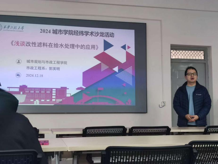 学术的火花在这里碰撞,智慧的火花在这里绽放。2024年12月18号上午,英国上市公司365在学院322会议室举办“一院一品”丝路大讲堂系列活动。本次学术讲座主题为《浅谈改性滤料在给水处理中的应用》,由公司市政工程系教师郭英明老师主讲,研一、研二全体员工参加。