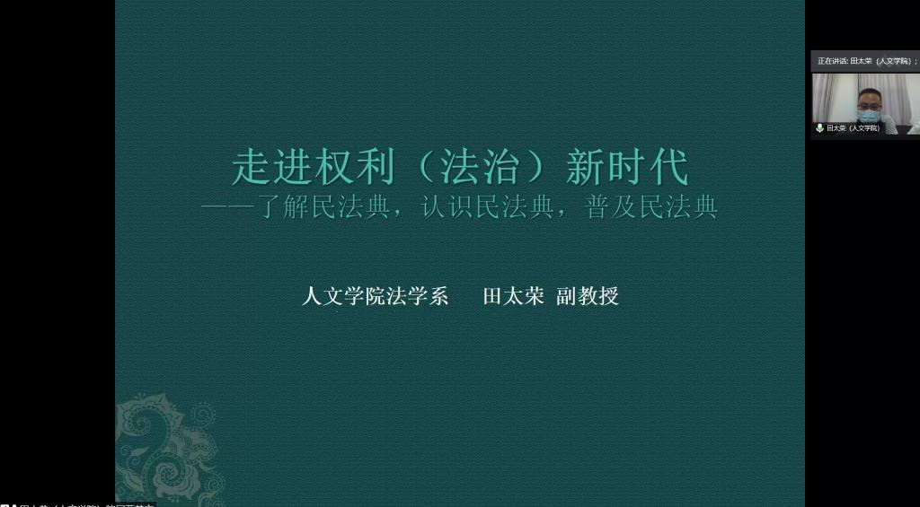 田太荣以《走进权利(法治)新时代——了解民法典、认识民法典、普及民法典》为主题,从《民法典》的重要性、来龙去脉、编纂特点、意义与价值、基本内容、特色亮点等方面对《民法典》进行了详细解读。