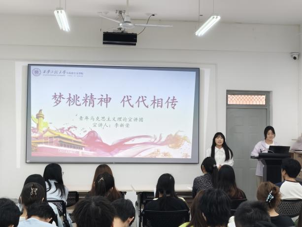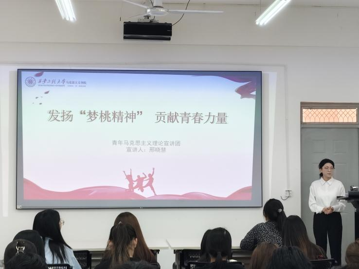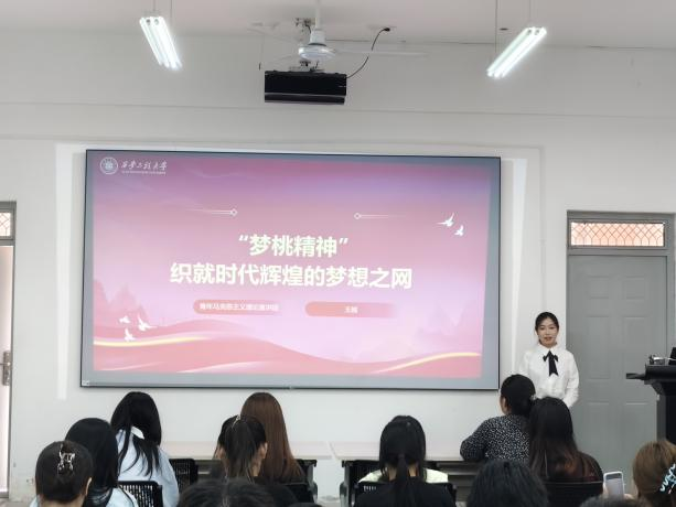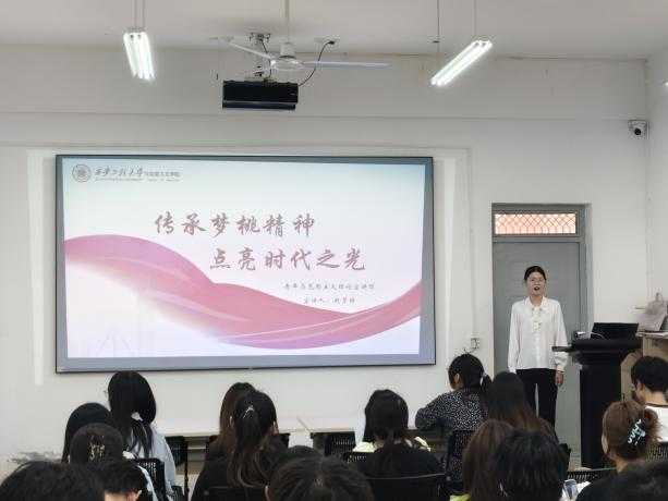 随后,宣讲团成员依次上台分享。韩一冉以“梦桃精神,代代相传”为主题,讲述了梦桃精神在时代发展中的传承脉络,用一个个鲜活的事例展现了梦桃精神历久弥新的生命力。赵梦婷以“传承梦桃精神,点亮时代之光”为题,结合当下社会发展需求,阐述了梦桃精神如何在新时代焕发出新的光彩,激励着青年学子在新时代的浪潮中勇立潮头。李新荣同样围绕梦桃精神的当下传承,从个人感悟出发,分享了梦桃精神对自己成长和价值观塑造的深刻影响。王越则以“梦桃精神:织就时代奋进的梦想之网”为切入点,剖析了梦桃精神与时代发展、个人梦想之间的紧密联系,鼓励学员们将个人梦想融入时代发展大局。邢晓慧以“发扬梦桃精神贡献青春力量”为主题,号召青年学员们积极践行梦桃精神,在青春的赛道上奋力奔跑,用实际行动为社会发展贡献青春力量。