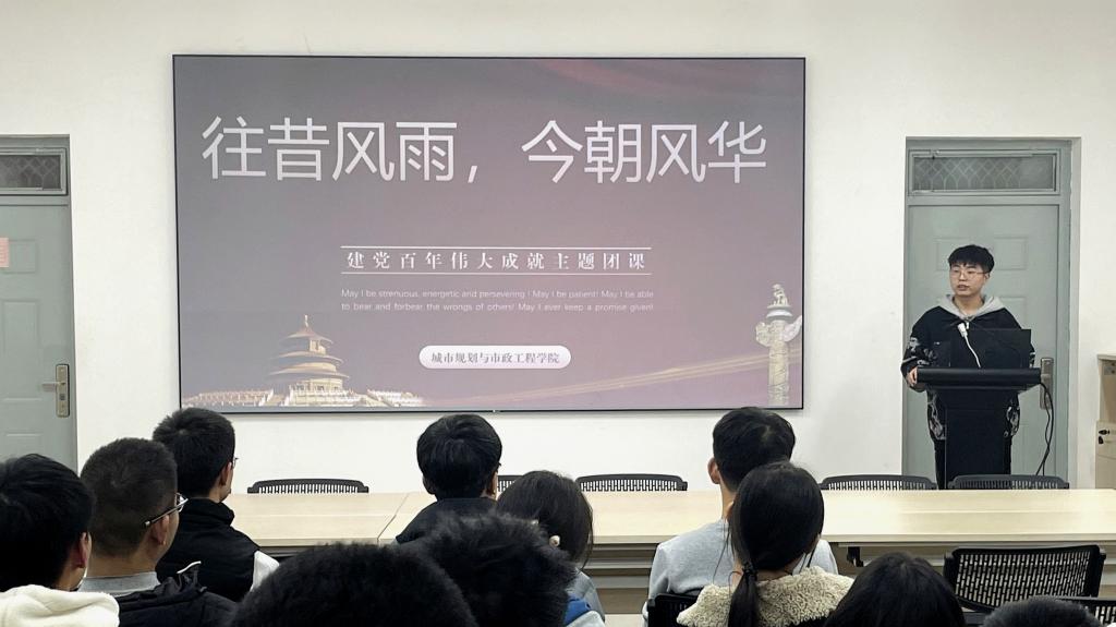 团课第五讲,学院“初心”党史宣讲团成员闫可鑫讲授了《“往昔风雨,今朝风华”—建党百年伟大成就》的主题团课。他从三个方面向学员讲述了建党百年的伟大成就。从新民主主义革命时期到社会主义革命和建设时期再到如今的社会主义现代化建设时期,每个时期都有许多值得我们学习的先辈,他们身上所具备的那种舍己为人的精神值得每一位青年团员学习。最后,他希望全体学员要努力学习,勇于奋斗,做新时代具有责任意识和创新精神的建设者。