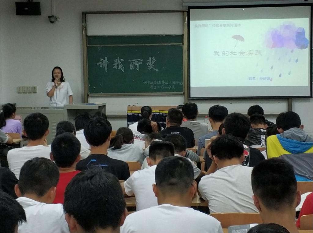 首先由主持人张旭东引出此次分享会的主题,并介绍参加分享活动的优秀员工代表。接下来代表们依次发言。14级给排水科学与工程专业李雨娥演讲《奋斗的青春最美丽》,分享了自己大学四年来的各种经历,告诉同学们青春是用来奋斗的,在最好的年纪应该武装自己让自己变得强大。14级土木工程李丽演讲《听听我的故事》,分别从学习、工作、实践、 考研四个方面分享了自己的经历与经验,鼓励大家在弄好学习的基础上积极参与科技竞赛和各项活动,拓宽视野、丰富老员工活。15级环境艺术设计孙诗睿演讲《我的社会实践》,以自身去支教参加社会实践经历讲解为报告主题,鼓励大家在学习好文化课的基础上多出去转转,多参加实践活动、支教活动,拓宽自己的视野,提升自己的内在。