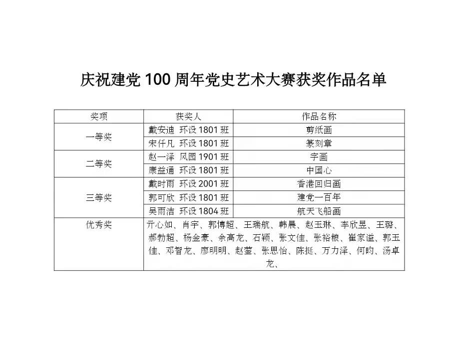 作为学院庆祝建党100周年“七个一”系列主题活动之一,大赛自四月举办以来共收到师生参赛作品近百份,作品创作形式丰富多样,设计内容精彩纷呈。经专家评审,最终产生一等奖2个(组),二等奖2个(组),三等奖3个(组)。