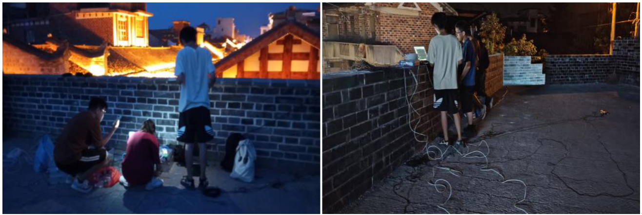 在为期6天的实地检测中,实践团运用先进的无损检测技术,对武冈古城墙的墙体、城门等关键部位进行了全面检测。团队成员通过在城墙不同位置布置传感器,记录城墙在环境激励下的振动响应,以此分析城墙的动力特性,包括自振频率、阻尼比等参数。这些参数对于评估城墙结构的完整性和稳定性至关重要。团队成员魏茜和康清煜共同负责数据处理与分析工作,凭借在结构动力参数提取方面的专业能力,为团队检测数据的有效性提供了重要支撑。此外,团队还对城墙的外观进行了详细勘查,记录墙体表面的裂缝、风化等病害情况。