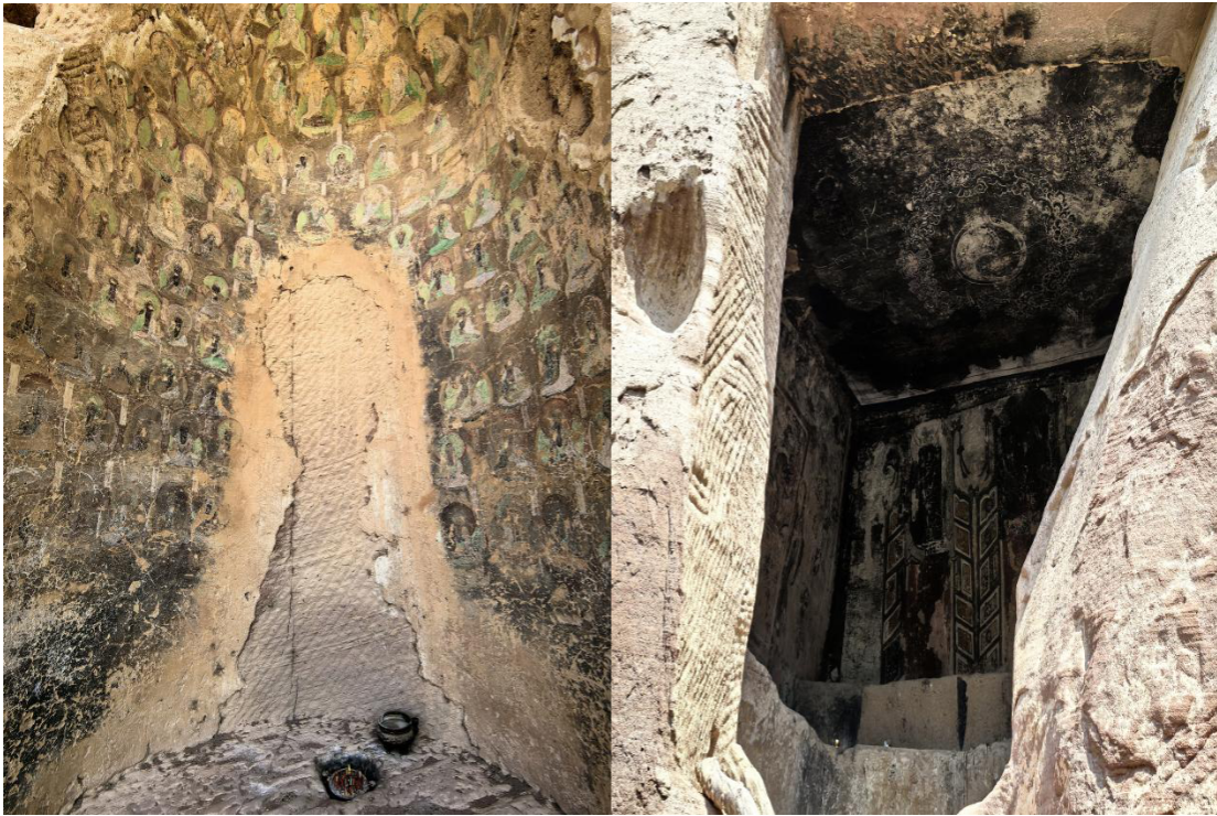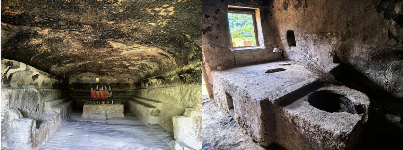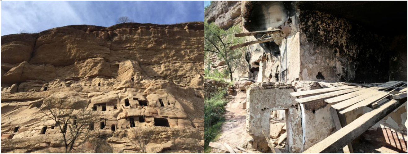 佛居双绝的“活化石”——悟空洞是旬邑崖居群中唯一同时保存佛教造像、壁画与生活遗迹的综合性遗址。其唐代石佛虽面容被泥塑遮盖,似笑非笑的神秘姿态却成为崖居群最引人遐想的标志;而洞内残存的唐代风格千佛壁画(红绿主色)与烟熏灶台并存,印证了此处从宗教圣地到避难居所的千年功能演变。本次旬邑崖居考察以悟空洞为核心样本,其北朝至唐的佛教遗存叠压宋元民居结构,为破解“丹霞崖居多功能演化”提供了关键地层证据。