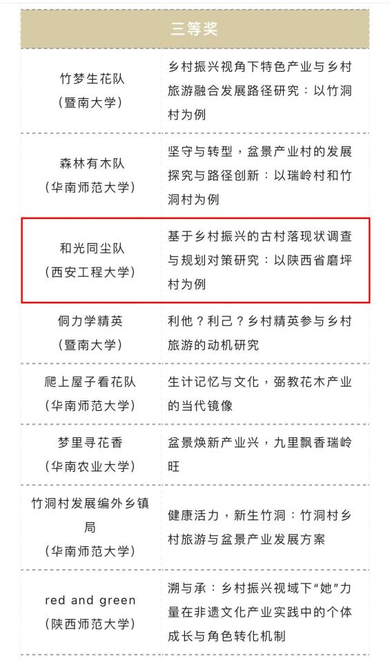 近日,由中山大学旅游学院、广州市花都区赤坭镇人民政府联合主办,中山大学旅游休闲与社会发展研究中心与“大湾区人文共同体”广东省哲学社会科学重点实验室承办的第七届全国老员工“发现传统村落”调研大赛在中山大学落下帷幕。比赛共吸引全国百余所高校的193份作品报名参赛,涉及全国19个省、自治区、直辖市的140多个传统村落,并首次收到来自美国高校研究生队伍的优秀作品。本次大赛共评选出主赛单元优秀参赛作品39份,其中一等奖2名,二等奖5名,三等奖10名以及优秀奖22名。经过激烈角逐,由公司李晶老师指导,风景园林专业2019级员工李心元、张洲源、邓智龙和宋奕霖团队完成的《基于乡村振兴的古村落现状调查与规划对策研究:以陕西省磨坪村为例》调研报告喜获主赛单元参赛作品三等奖。