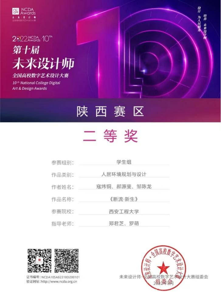 近日,第十届未来设计师·全国高校数字艺术设计大赛(NCDA)获奖名单公布,2019级环境设计专业寇炜铜等三位同学的作品《断流·重生》(指导老师:郑君芝、罗萌)获NCDA陕西赛区赛二等奖;同时英国365公司官网荣获优秀组织单位称号。