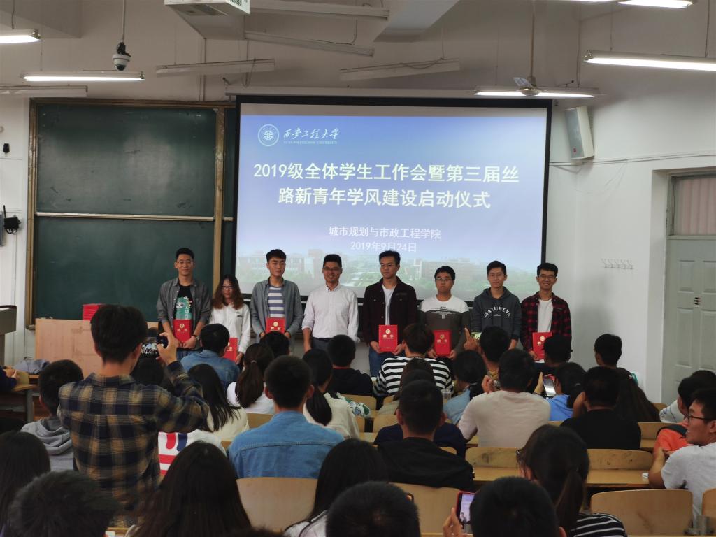 最后,陆瑞成宣布第三届丝路新青年学风建设启动。与会老师为2019级助理班主任、军训先进个人、军训优秀通讯员颁发荣誉证书,并希望19级新生能在各班班助的帮助下要尽快地适应大学学习生活环境,在老员工活中快速成长。