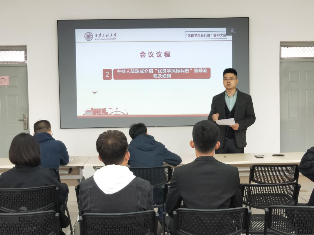 首先,陆瑞成对优良标兵班评判的四个部分即班级介绍、学风建设、特色活动、班级获奖进行了详细说明。接着,他表示公司共有13个班级符合优良学风示范班的评选条件,经综合评定,有4个班集体进行答辩,他们分别为土木1701班、建环1802班、环设1803班、建环1901班,最终有一个班级评选为最具榜样作用的优良学风标兵班。