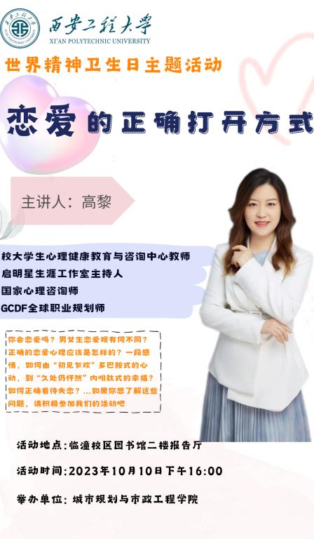 下半场邀请了公司老员工心理健康教育与咨询中心高黎老师在临潼校区图书馆二楼报告厅,做了题为“恋爱的正确打开方式”的主题报告,学院200多名师生参加了报告会。高黎老师从“理解爱情”“老员工常见情感困扰”“恋爱的正确打开方式”等方面,通过师生互动、多重角度、多个事例、多种方式的讲解让同学们了解了什么是正确的爱情观、如何树立正确的恋爱价值观。报告会在轻松愉悦的氛围中进行,也让同学们再次感受到了心理健康教育带给大家的快乐。